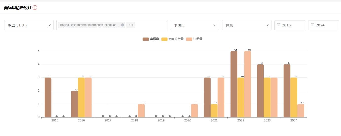 欧盟:借助EUIPO渠道提交215件申请,重点布局第38类(通讯服务)、第42类(技术研发)。