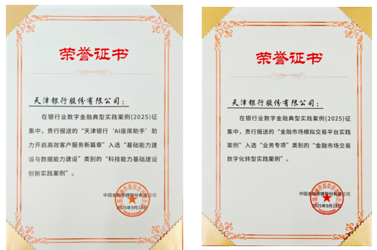 日前,在中国金融传媒股份有限公司主办的“银行业数字金融典型实践案例(2025)”征集活动中,天津银行凭借在智能客户服务与金融市场人才培养领域的深度数字化实践,一举斩获两项荣誉——“AI座席助手”项目入选“基础能力建设与数据能力建设”类别“科技能力基础建设创新实践案例”,“金融市场模拟交易平台”项目入选“业务专项”类别“金融市场交易数字化转型实践案例”,充分彰显该行在数字金融领域的创新实力与行业示范价值。